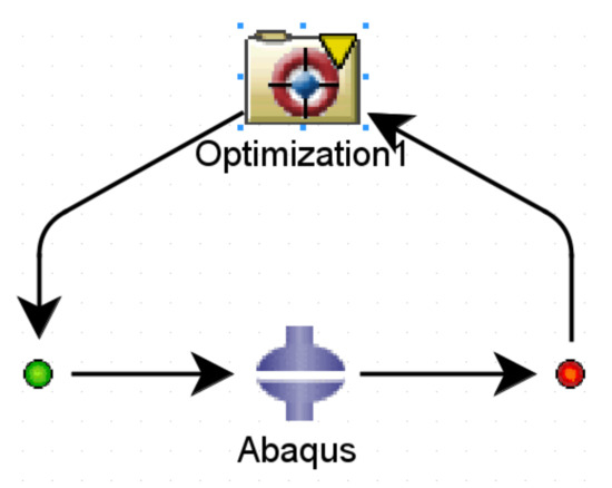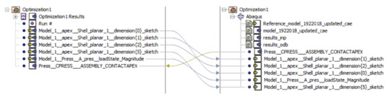 The optimization aims to obtain such a shape of the apex that no air traps are formed when it is mounted onto the bead. Based on the conclusions of the numerical analysis, it was decided that the objective function would be to maximize the minimal contact pressure between on the apex and the separator at the end of the simulation. The intention is also to increase the contact area between the apex and the bead. The optimization was performed in Isight software. As can be seen in Figure 10, the sim-flow scheme consists of only two components, optimization and Abaqus. After the optimization task is set, the optimization process starts. The initial model is loaded into Abaqus, and the calculation is performed. Isight suggests new apex dimensions, sends the updated Abaqus file to the solver, and re-simulates the model. The results are returned to Isight, which evaluates whether the solution was feasible, infeasible, or optimal. Each solution is compared with the previous one and evaluated which is better.