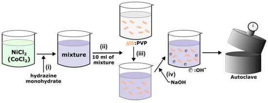 Schematic illustration of the synthesis of cNNH. (i) Insertion of the hydrazine monohydrate into the NiCl2 (additional CoCl2 in Co-doped cNNH) precursor, (ii) 10 mL extraction of a mixture, (iii) insertion of the mixture into the PVP precursor, and (iv) insertion of NaOH into the mixture.