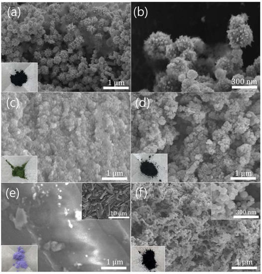 Figure 2 shows the SEM images of the prepared samples. The cNNH sample’s spherical surface was covered in nano-sized spikes, as shown in Figure 2a,b. The diameter of the particles was ~300 nm. The color of the cNNH was black, as shown in the inset in Figure 2a. The samples synthesized without hydrazine monohydrate consisted of small particles with diameters of ~50 nm, as shown in Figure 2c. The synthesized particles were olive in color, as shown in the inset in Figure 2c. In the samples synthesized without PVP, particles of a few nanometers in size agglomerated to form irregular powders, as shown in Figure 2d. PVP acts as a surfactant in the synthesis process. It selectively adsorbs on the facets of Ni crystals and, thus, kinetically controls the growth rates of the crystals [16]. Therefore, the spike shapes did not form. The color of the sample without PVP was black, as shown in the inset in Figure 2d. As shown in Figure 2e, the samples synthesized without NaOH consisted of large rods with a length of ~10 μm. The color of the precipitate was pale violet (inset in Figure 2e), thereby implying that the samples synthesized without NaOH did not form Ni through the ligand exchange reaction during the heating process. The morphology of the Co-doped cNNH particles, shown in Figure 2f, was roughly spherical with diameters of up to 100 nm. The doping with Co ions had a significant influence on the morphology and particle size of cNNH.