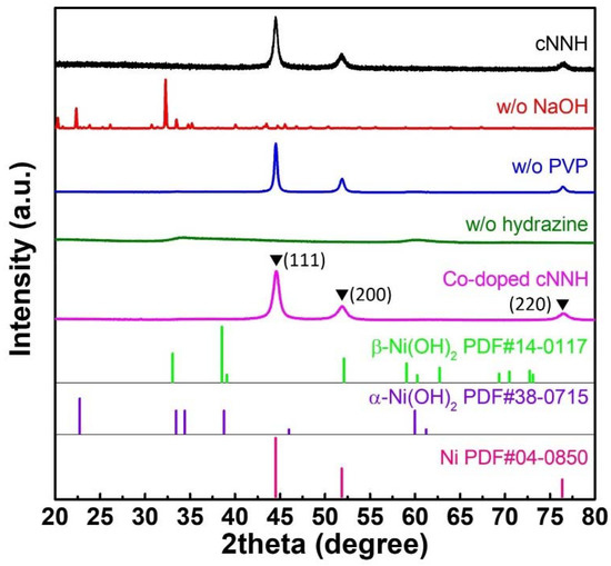 As shown in Figure 3, the XRD pattern of cNNH exhibited three peaks at 44.5°, 51.8°, and 76.4°, which were indexed to the (111), (200), and (220) planes, respectively. These peaks match those of face-centered cubic Ni (JCPDS No. 04-0850). The low background intensity and relatively strong peaks indicate that the as-synthesized Ni particles were highly crystalline. The samples synthesized without hydrazine monohydrate exhibited two broad peaks, which were indexed to poorly crystalline Ni(OH)2. For the samples synthesized without PVP, diffraction peaks were observed at 44.5°, 51.8°, and 76.4°, which were indexed to the (111), (200), and (220) reflections of Ni, respectively. This pattern is the same as that of cNNH, which indicates that PVP can only affect the morphology, but not the crystallinity or phase of the materials. The diffraction patterns of the samples synthesized without NaOH showed a complicated pattern, suggesting that it was a mixed nickel hydrazine complex with a side product. The possible reactants are shown in Figure S1. The diffraction peaks of Co-doped cNNH were assigned to Ni. The peaks were slightly broader than those obtained for cNNH. This can be attributed to the different ionic radii of the doped Co ions in the crystalline Ni structure. Peaks for cobalt oxides, hydroxides, or other impurities were not detected, indicating that Co was well doped into cNNH.