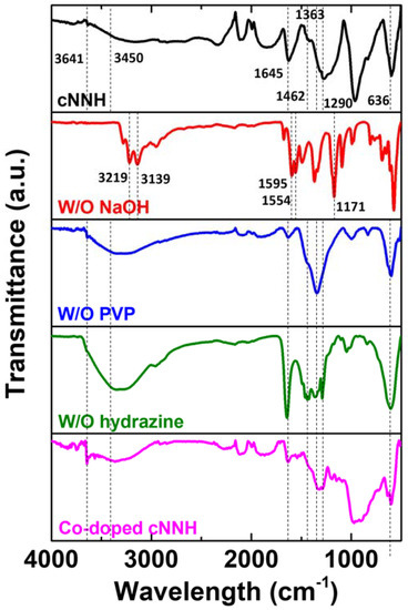 FTIR patterns of cNNH, samples without NaOH, without PVP, without hydrazine, and with Co-doping.