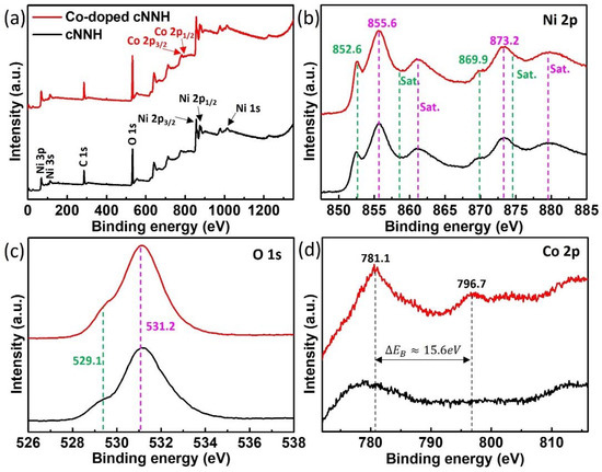 XPS spectra of cNNH and Co-doped cNNH. (a) Survey scan, (b) Ni 2p, (c) O 1s, and (d) Co 2p.