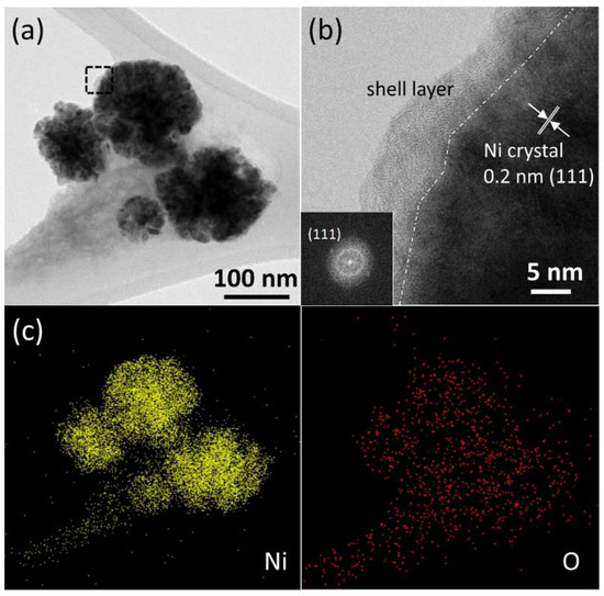 (a) Low- and (b) high-resolution TEM images of cNNH and (c) EDS mapping images of Ni and O (the inset of (b) shows the FFT image of crystalline Ni).