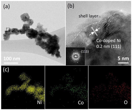 The detailed morphology of cNNH and Co-doped cNNH was investigated via HR-TEM analysis. Figure 6 shows the TEM image and EDS data for cNNH. As shown in Figure 6a, cNNH was composed of thick inner particles and thin outer layers. The black dotted region in Figure 6a is enlarged and shown in Figure 6b, indicating that the low-crystalline layer can be distinguished from the crystalline core. The lattice spacing of the crystalline cNNH was measured to be 0.2 nm, corresponding to the d-spacing of the (111) lattice plane of Ni. The thickness of the shell layer was approximately 5 nm. The fast Fourier transform (FFT) pattern in the inset in Figure 6b exhibits a diffused ring and discernible diffraction spots, indicating the coexistence of an amorphous structure and crystalline Ni, respectively. The elemental mapping images of Ni and O in Figure 6c show that the species were homogeneously distributed in the particles. Figure 7 shows the TEM and EDS data of Co-doped cNNH, and Figure 7a shows that a thin layer covers the particles. The HR-TEM image of the dotted square region in Figure 7a shows the inner crystalline particle and the outer low-crystalline layer (Figure 7b). The measured lattice spacing corresponding to the d-spacing of the (111) lattice plane of Ni was 0.2 nm. The elemental mapping images of Ni, Co, and O (Figure 7c) show a uniform particle distribution. The inset in Figure 7b shows the corresponding FFT pattern of Co-doped cNNH. The diffraction spots identified in the pattern are consistent with the XRD results.