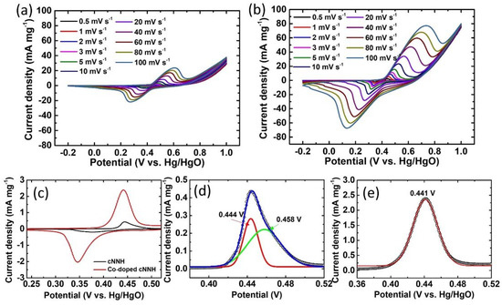Figure 8a,b show the CV curves of cNNH and Co-doped cNNH between −0.2 and 1.0 V at different scan rates. The two strong oxidation and reduction peaks were attributed to the reversible Faradaic reaction between Ni(II) and Ni(III) due to OH− insertion/desertion. The oxidation and reduction peaks were nearly symmetric, indicating the excellent electrochemical reversibility of cNNH and Co-doped cNNH. The area under the CV curves of Co-doped cNNH was significantly greater than that of cNNH, indicating that Co-doped cNNH had a higher specific capacitance than cNNH. Figure 8c presents the redox peaks of cNNH and Co-doped cNNH at a scan rate of 0.5 mV s−1 on a magnified scale, indicating the difference between the two peaks. The cNNH peak shown in Figure 8d can be fit using the two peaks at approximately 0.444 and 0.458 V. The peak of Co-doped cNNH shown in Figure 8e can be fit using a peak at ~0.441 V. The CV peaks of nickel hydroxide can be attributed to two redox reactions, α-Ni(OH)2 ↔ γ-NiOOH and β-Ni(OH)2 ↔ β-NiOOH, because they exist in two different polymorphs. The oxidation of α-Ni(OH)2 to γ-NiOOH occurs at a lower potential than that of β-Ni(OH)2 to β-NiOOH [24,25]. This suggests that the peak at ~0.444 V is related to γ-NiOOH formation, whereas that at ~0.458 V is related to β-NiOOH formation. The β-Ni(OH)2 peak of cNNH can be attributed to the transformation due to instability in an alkaline aqueous environment. Co-doped cNNH was mainly attributed to the redox reaction, α-Ni(OH)2 ↔ γ-NiOOH. This indicates that Co-doping improves structural stability in alkaline media.