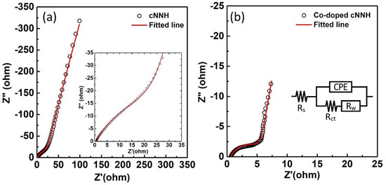 Figure 9a,b show the Nyquist plots of cNNH and Co-doped cNNH, respectively. The Nyquist plots show compressed semicircles in the high-frequency region and inclined lines in the low-frequency region. The shapes were modeled using an equivalent circuit, as shown in the inset of Figure 9b. Rs is the intersection point on the Z’ axis in the high-frequency region, which corresponds to the combination of the resistance of the electrolyte and contact resistance. The Rs values of cNNH and Co-doped cNNH were approximately 0.67 and 0.63 Ω, respectively. Rct obtained by estimating the diameter of the semicircle is the charge-transfer resistance, which is associated with the Faradaic reactions of the active materials. The semicircle observed for Co-doped cNNH had a significantly smaller diameter than that observed for cNNH, indicating that the Rct of Co-doped cNNH (5.9 Ω) is lower than that of cNNH (36.7 Ω). The constant phase element (CPE) is the capacitance of the outermost surface of the electrode. A CPE was used instead of a capacitor owing to the inhomogeneity or roughness of the interface. Rw represents the inclined line in the low-frequency region and is the diffusive resistance of the electrolyte ions inside the nanomaterials. The results of the EIS analysis showed that the Rs, Rct, and Rw of Co-doped cNNH were lower than those of cNNH.