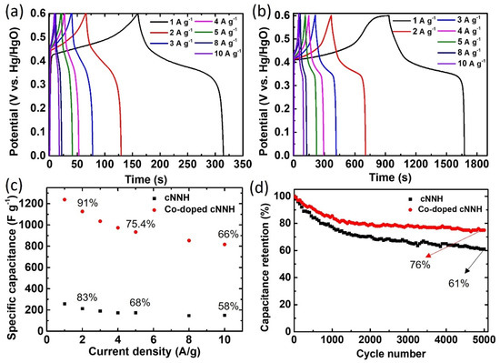 GCD curves of (a) cNNH and (b) Co-doped cNNH. (c) Calculated specific capacitance of cNNH and Co-doped cNNH at various current densities. (d) Cycle tests of cNNH and Co-doped cNNH at a current density of 3 A g−1.