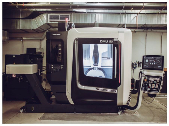 The universal CNC milling machine from DMG Mori allows machining in five independent axes (Figure 1). The machine spindle allows movement in the X, Y and Z axes. The machine table enables rotation in the B and C axes, where the range in the B axis is −35/+110°. The maximum spindle speed of the machine is 15,000 rpm, and the rapid transverse speed is 30 m/min.
