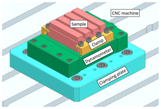 Figure 2 shows the attachment of the sample to the dynamometer by means of clamps and Allen screws. The dynamometer itself was attached to the clamping plate, which was attached to the table of the CNC milling machine with the help of Allen screws.