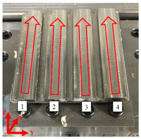 Figure 3 shows planar milling sections made during the experiment. The red arrows indicate the direction of the tool movements during machining at the selected parameters. Each number indicates different cutting conditions.