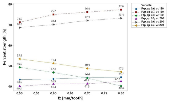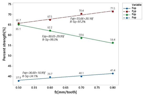 Figure 5 shows a graphic display of the result for various cutting conditions. As in Figure 4, the force Fy had the largest percentage, and its value increased with increasing tooth feed. The Fx forces had the lowest initial values. This graph shows that the force trends were the same for all cutting conditions.