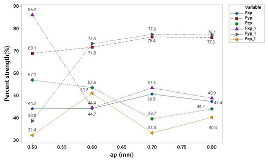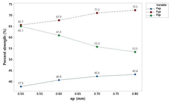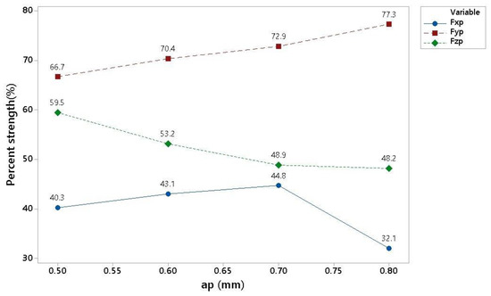 For a better interpretation of the calculated data in Table 6, the graph presented in Figure 4 was drawn up. From this graph, it is clear that for the engagement depth ap = 0.5 mm in the measured displacement range of 0.5–0.8 mm/tooth, the Fxp component had the smallest increase. A stronger trend can be seen in the Fyp curve, where the share increased by approximately 6%. On the contrary, the decline in the Fzp component was approximately 9%.