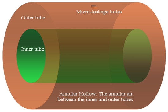 Figure 1 illustrates the schematic of the physical model for the micro-leakage of casing pipes. The medium in the pipes is methane, the annular medium is air, and the environment outside the annular medium is assumed to be air with a pressure of 0.1 MPa. When casing pipes leaks, high-pressure gas in the annular air is ejected from the micro-holes in the casing wall and produces a sound source. The sound source signals can be detected by the ultrasonic instrument arranged in the casing pipes, thus achieving the purpose of pipeline leakage detection. The model parameters are listed in Table 1.