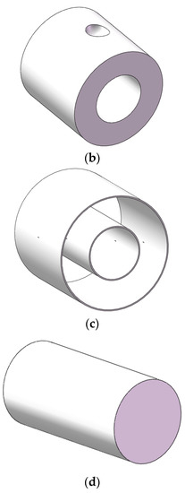 The dimensions of the sound source area (near the leakage hole): the left side of the sound source area is a hemisphere with a diameter of 50 mm, and the right side of the propagation area is 30 mm in diameter and 100 mm in length. the middle part is 5 mm long and 0.5 mm wide (Figure 3a). Sound propagation zone model (annulus region): 215 mm outer diameter, 109 mm inner diameter, 200 mm length, leakage position for the 50 mm diameter hemisphere (Figure 3b). Pipe model size: outer diameter 220, inner diameter 104 mm, thickness 5 mm (Figure 3c). Exterior zone model for sound propagation (oil casing pipe): diameter 99 mm, length 200 mm (Figure 3d).