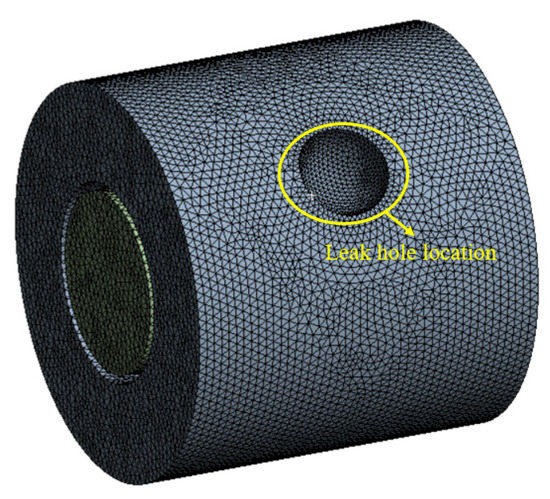 According to the acoustic comparison theory in aeroacoustics, aerodynamic sound sources can be divided with respect to physical mechanisms into quadrupole sound sources, dipole sound sources, and monopole sound sources. All aerodynamic sound sources can be regarded as the combined distribution of quadrupole, dipole, and monopole [23]. In casing pipe leakage, the fluid interacts with the wall surface of the leakage holes to produce a dipole sound source, and the high-speed flow of the fluid near the leakage holes produces turbulent stress, that is, a quadrupole sound source. Monopole sound sources generally only exist in an unstable state when the gas flow rate is low. Since the flow rate near the leakage holes is relatively high, this study does not consider monopole sound sources. The ratio of the radiated sound power of the quadrupole source to that of the dipole source is proportional to the quadratic square of the gas flow rate. Here, considering that the large inner-outer pressure difference produces a high gas flow rate at the leakage holes [24,25,26], the leakage sound source can be characterized by the quadrupole sound source in the computation.