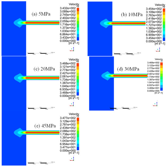 The flow field distribution of a square leakage hole with a side length of 0.4 mm under different inner-outer pressure differences of 5, 10, 20, 30, and 45 MPa is shown in Figure 6. According to the flow field distribution, the flow field changes caused by leakage are mainly concentrated near the leakage hole, which has a minor influence on the pipeline interior.