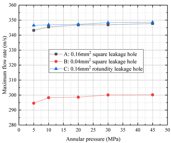Maximum flow rate under different leakage hole shapes, sizes, and annular pressures.