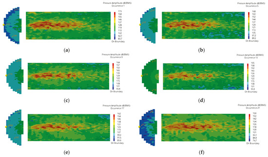 SPL distribution in the sound source zone. (a) 20,000 Hz (b) 24,000 Hz (c) 28,000 Hz (d) 32,000 Hz (e) 36,000 Hz (f) 40,000 Hz.