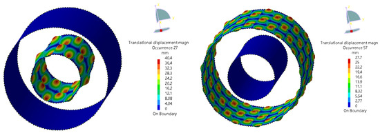 The acoustic source zone’s sound pressure level (SPL) cloud diagram is shown in Figure 8. It can be observed that the sound pressure at the interface between the sound source zone and the inner domain (annulus region) of the sound propagation zone is uniformly distributed. Therefore, it is reasonable to select the sound pressure of an arbitrary point at the interface as the external source for the computation of the sound propagation zone. The sound pressure distribution of the equivalent sound source is shown in Figure 9. When the frequency is 32,000 Hz, the highest sound pressure amplitude is 18 Pa. Figure 10 shows the structural modal vibration shapes of the oil and casing pipe. At the frequency of 20,000.6 Hz, the maximum displacements of the oil and casing pipe are 40 and 27.7 mm, respectively.