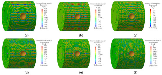 Sound pressure distribution in the annulus region and inside the oil pipe. (a) 20,000 Hz (b) 24,000 Hz (c) 28,000 Hz (d) 32,000 Hz (e) 36,000 Hz (f) 40,000 Hz.