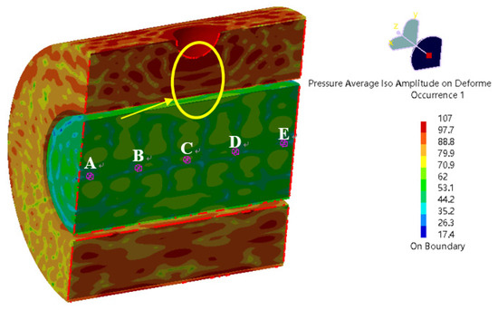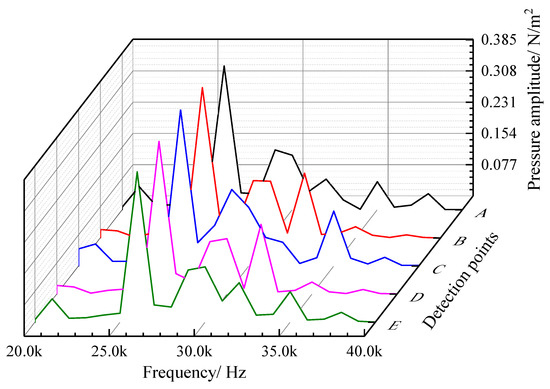The spectrum curves of the sound pressure frequency of five field points (A, B, C, D, and E) on the axis line of the oil pipe are shown in Figure 13. The acoustic wave characteristics are consistent at different positions in the axial direction, and the sound pressure shows no obvious difference. There are several peak values on the frequency spectrum curve of each field point, most of which are concentrated in the range of 25,000–35,000 Hz. At 26,000 Hz, the peak value of the frequency spectrum takes the largest value of 0.309 Pa, i.e., 83.8 dB (the reference value is 2 × 10−5 Pa), which is significantly lower than that of the equivalent sound source.