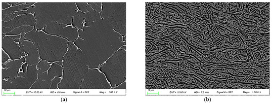 The main chemical composition and mechanical properties of Ti600 and TC18 are shown in Table 1 and Table 2. Figure 1 shows the microstructures of two alloys. Ti600 alloy consisted of equiaxed primary α phases and a small amount of lamellar α + β phases with clear phase boundary (Figure 1a); its phase-transition temperature is 1010~1015 °C. TC18 alloy is composed of needle-like α phases and is composed of net basket microstructure (Figure 1b); its phase-transition temperature is about 875 °C.