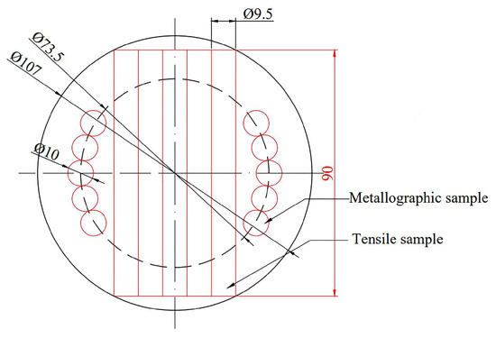 The vacuum heat treatment tube furnace (GSL-1700X, Hefei, China) was used to perform stress-relief annealing and two-stage annealing for the Ti600/TC18 joints. The heat-treatment process parameters are shown in Table 3 and Table 4, respectively. The metallographic and tensile samples were prepared by the disc-shaped Ti600/TC18 joint, as shown in Figure 2.