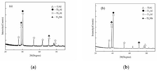 The XRD results of Ti600/TC18 joints after stress-relief annealing and two-stage annealing are shown in Figure 7. After annealing, the phases are mainly composed of TiAl, Ti2Al, Ti3Al, Ti4Nb. The morphology, distribution, size, and content of each phase of Ti600/TC18 joints are all affected by heat treatment [23,24].