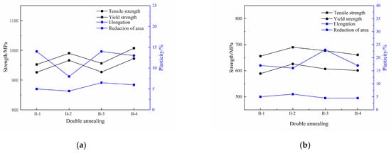 The purpose of annealing at low temperatures is to promote the decomposition of the metastable phase in a certain way, which is produced during high-temperature annealing, thus causing aging strengthening. There is no significant variation in the αp phases with the temperature increase of the low-temperature stage (II-3, II-4); while the deformed structure αs phases are gradually spheroid, the grain size of αs phases and their content are both increased. The αs phases are directionality distributed on the transformed β matrix at 590 °C (Figure 6c); they are coarsened with an obvious direction at 610 °C (Figure 6d).