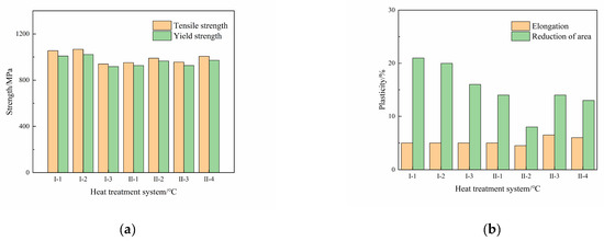 The tensile properties of the Ti600/TC18 joints after different heat treatments are shown in Figure 10 and Figure 11. It can be seen that the tensile properties of Ti600/TC18 joints after stress-relief annealing (I) are superior compared to those of the joints after two-stage annealing (II).