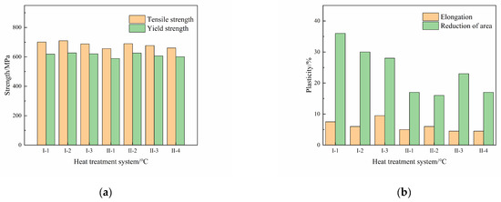 The tensile properties at room temperature of Ti600/TC18 joints after different heat treatments: (a) strength; (b) plasticity.