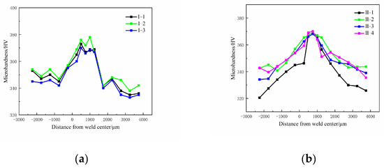The microhardness values of joints were tested by a micro-Vickers hardness tester (BUEHLER MICROMET5104, Akashi Corporation, Osaka, Japan), where the test load was 0.98 N and the loading time was 10 s. The microhardness values of the joints were measured from the starting point, which was the intersection point of the WZ and HAZ of the Ti600 alloy. A point was measured at an interval of 500 μm from the origin to both sides. Finally, the points reached 2250 μm to the left of the starting point; they reached 3750 μm to the right of the starting point.