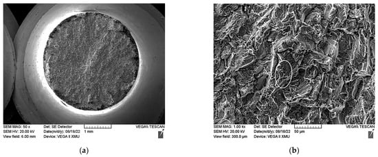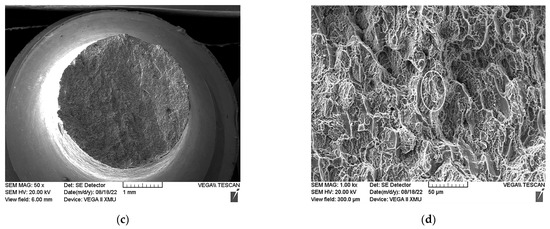 The macroscopic and microscopic fracture morphologies of the Ti600/TC18 joints after the stress-relief annealing temperature (I-2) and two-stage annealing (II-4) are shown in Figure 14 and Figure 15, respectively. In addition, the tensile fracture occurred at the TC18 side, near the weld. It can be seen that the macroscopic fractures are similar: they have the typical shape of a ductile fracture.