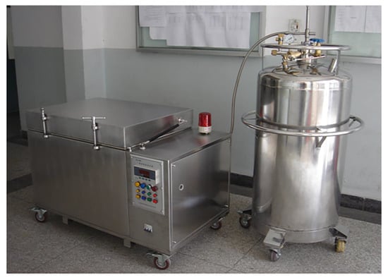 A solution treatment (S) was carried out using a SX-5-12 box resistance furnace. The samples were heated to 510 °C and held for 2 h with subsequent water-quenching at room temperature. Cryogenic treatment is usually divided into shallow cryogenic treatment (−40~−80 °C) and deep cryogenic treatment (−80~−196 °C) according to the minimum temperature [,]. The previous research has demonstrated that the improving effects of cryogenic treatment can be promoted with a decrease in treating temperature []. In this work, cryogenic treatment (C) was conducted by cooling down quenched samples to −196 °C at the rate of 1 °C/min. The samples were then held for 12 h. The program-controlled SLX-80 cryogenic system was used for carrying out cryogenic treatment, as is shown in Figure 1. After 12 h of storage, samples were warmed up to room temperature in the atmosphere for 15 min. The artificial aging treatment (A) was carried out using a DZF-6210 vacuum-drying oven. During the aging process, the composite materials were heated to 170 °C and held for r2, 6, 10, and 20 h, respectively, before being cooled to room temperature. The time of cooling to room temperature was approximately 10 min. In this study, cryogenic treatment was conducted in combination with solution and aging treatments in various sequences. All combinations are presented with necessary illustrations in Table 2. The alphabetic order of each combination refers to the specific conducting sequence of the three basic treatments. For example, the process of SCA6 indicated that the samples were subjected to solution treatment, cryogenic treatment, and aging treatment for 6 h successively.