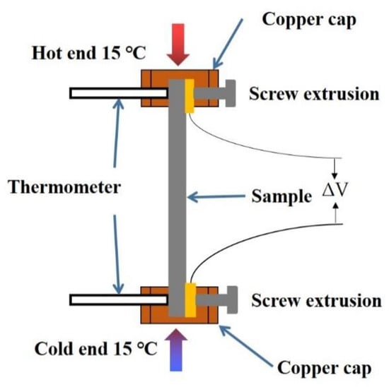 The thermoelectric power (TEP) method was adopted for evaluating the microstructure evolution during aging. The principle of TEP measurement was to establish a temperature gradient at both ends of the samples and to measure the voltage difference between the two ends of the samples caused by the Seebeck effect. Based on the measurement principle of TEP, the apparatus was built according to the diagram shown in Figure 2. The sample size was 70 × 5 × 3 mm3, and its ends were fixed on the copper cap by bolts. The lower copper cap was regarded as the cold end (T), whose temperature was controlled by heating in ice water to maintain 15 °C. The upper copper cap was regarded as the hot end (T + ΔT), whose temperature was controlled by heating to maintain 25 °C. An Agilent 34975A data collector was used to record the voltage (ΔV) difference at both ends of the sample, and the acquisition step was 5 s. The relative TEP was defined as follows: