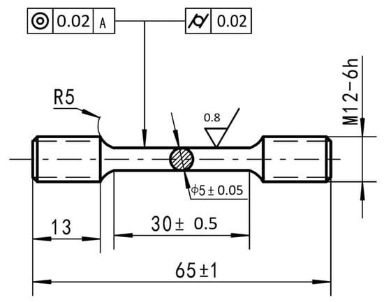 The Rockwell hardness (HRB) was tested according to the Chinese standard of GB/T 230.1-2018 with a SHBRV-187.5 digital Blackwell & Vickers hardness tester with a margin of error of ±2%. The loading force of the test was 100 Kg, and the duration was 5 s. Five points were tested for each sample, and the mean values were obtained as the final result. For further exploration of the effect of the sequence of cryogenic treatment and aging treatment on the mechanical properties of the composites, the electronic universal testing machine was used for the tensile test. Tensile specimens were prepared in accordance with the GB/T 228-2002 standard; the sample dimension is shown in Figure 3. The strain rate during the tensile process was 0.001/s. Three samples of each treatment (SA20, SCA20, SA20C) were tested and averaged as for a final result.