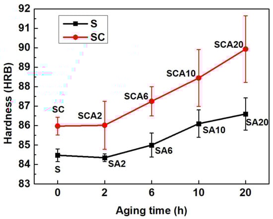 The hardness variations of the 15%SiCp/2009Al composites with different aging times are shown in Figure 4. It can be seen that the hardness increases with an extension of aging time. However, the hardness of both SA2 and SCA2 exhibited no obvious change when compared to that of the S and SC, respectively. The hardness of the sample treated with SC was higher than that of the sample treated by S. After aging for 6 h and 10 h, the hardness was obviously increased. With the increase of aging time to 20 h, the improvement in hardness induced by cryogenic treatment became more obvious and was approximately 2–4% higher than that of the samples without cryogenic treatment. In the 15%SiCp/2009Al composites, the Rockwell hardness was affected by the SiC particles and the aluminum matrix. As the SiC-reinforced phase cannot be altered by aging treatment and cryogenic treatment, the change in hardness can be mainly attributed to the microstructure evolution of the aluminum matrix.