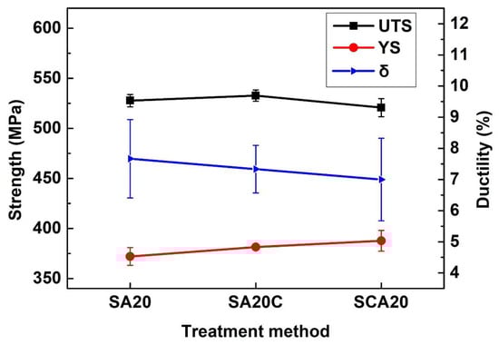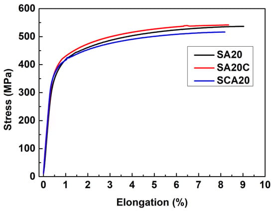 In order to investigate the effect of cryogenic treatment and its combination sequence with traditional heat treatment on 15%SiCp/2009Al composites, samples treated with SA20, SA20C, and SCA20 underwent tensile tests. The results are compared and shown in Figure 5 and Figure 6. It can be seen from Figure 5 that the trend of stress–strain curves is consistent in the tensile process for all the specimens. The tensile strength, yield strength, and elongation can be obtained from these curves, as is shown in Figure 6. It can be observed that SA20C shows a slight improvement in tensile strength, while SCA20 demonstrates the opposite effect. However, this change in tensile strength is too small and can be ignored. Both SA20C and SCA20 can improve the yield strength of the 15%SiCp/2009Al composites. The improvement caused by SCA20 is more effective, being 16 MPa higher than that of the SA20 sample. The tendency of reduction in elongation can be observed. Due to the relatively poor plasticity of aluminum matrix composites and the discreteness of elongation, this reduction can also be ignored. Therefore, the most obvious effect caused by cryogenic treatment is the improvement in yield strength when cryogenic treatment is performed after solution and prior to aging treatment.
