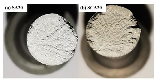 In order to further reveal the change in yield strength induced by cryogenic treatment, the macro and micro tensile fracture surfaces of SA20 and SCA20 were detected and compared, as is shown in Figure 7 and Figure 8. It can be seen from Figure 7 that the tensile fracture surfaces of both SA20 and SCA20 are flat and have no obvious plastic deformation, which shows that the fracture of the 15%SiCp/2009Al composite is a typical brittle fracture. The micro-fracture surfaces show that the tensile fracture is comprises a majority of brittle dents and a small number of ductile dimples with a small size, as is shown in Figure 8a,d. The inner surface of the dent is relatively smooth, and the shape of the tear edge is consistent with the profile of the SiC particles, marked by the dotted line cycles in Figure 8b,c,f. A large number of studies have shown that there are three main fracture forms of aluminum matrix composites [,]: the fracture of reinforcement particles, the decohesion of SiC particles from the matrix, and the fracture of the aluminum matrix. Therefore, the fracture of the samples in both states is dominated by the decohesion of SiC particles from the matrix. There are also a small number of cracks propagating through the particles, which means that the fracture of reinforcement particles exists. Although the macroscopic appearance is that of a brittle fracture, there are a few small-sized dimples in a small range of aluminum alloy matrices, shown in Figure 8e,f, indicating that ductile tearing is the crack propagation mode in aluminum alloy matrices. There are relatively more ductile dimples in the matrix of the sample after cryogenic treatment when compared with that of the sample without cryogenic treatment (see a comparison of Figure 8b with Figure 8e). The tensile strength of the 15%SiCp/2009Al composite is mainly decided by the bond strength between the SiC particles and the aluminum matrix. The plastic deformation behavior of the matrix has a great influence on the yield strength. It can be seen that the variations of interface caused by cryogenic treatment are not enough to cause the change in tensile strength during tensile process. However, the changes in the aluminum matrix induced by cryogenic treatment will be the main reason for the improvement in yield strength.