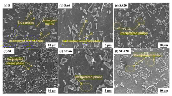 SEM micrographs of SiCp/2009Al composites treated by different processes: (a) S; (b) SA6; (c) SA20; (d) SC; (e) SCA6; and (f) SCA20.