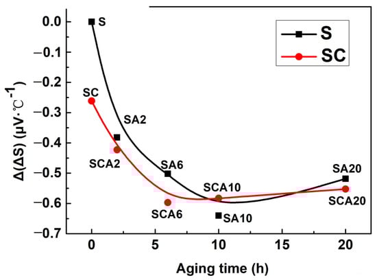 In order to further confirm the change of precipitation from the global microstructure of the materials, the TEP measurements of S and SC samples after aging treatment with different times were tested and compared. Lattice defects that alter the electrical conductivity or elastic properties of the Al matrix, such as solute atoms or precipitates, have an effect on ΔS []. Therefore, the change of solute atoms and precipitates can be characterized sensitively by TEP. The relative TEP value of the as-quenched samples (ΔS0) were taken as a reference, and the change value of ΔS was used to characterize the difference of precipitation and phase in the material; Δ(ΔS) = ΔSt − ΔS0, where ΔSt is the TEP value of the sample after aging at 170 °C for different times. The TEP values of the 15%SiCp/2009 aluminum matrix composites after aging for different times are shown in Figure 10. It can be seen that the TEP curves of the 15%SiCp/2009Al composites can be divided into a descending stage and an ascending stage. With the increase in aging time, the TEP values were first decreased and then increased, and finally tended to be stable for both the S and SC samples. Cryogenic treatment followed with solution (SC) decreased the TEP value apparently when compared with that of the S sample. For the SC samples, the minimum value of the TEP was obtained after aging treatment for 6 h. The TEP of the S sample was also decreased with the increase in the aging time, and the minimum value of the SC sample was obtained after undergoing aging treatment for 10 h.