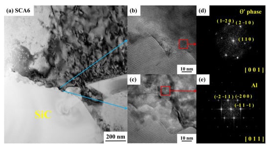 Micrographs of the 15%SiCp/2009Al composites treated by SCA6, (a) micrographs of SCA6 sample, (b,c) HRTEM micrographs of the selected areas in (a), (d,e) the FFT patterns of selected area in (b) and (c), separately.