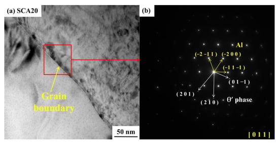 The samples of S and SC aged for 6 h and 20 h were adopted for TEM detection. It can be seen that the dislocation density in the aluminum matrix of the SCA6 sample was higher than that of SA6 sample, shown in Figure 11a,d. Many dislocation lines and some precipitates can be observed in the aluminum alloy and within the grain boundary in Figure 11d. It is well-acknowledged that the addition of SiC particles to the aluminum alloy can increase the dislocation density after quenching []. Cryogenic treatment can further increase the dislocation density. During the process of cryogenic treatment, excessive internal stress is generated at the interface due to the large difference of the expansion coefficient between the SiC and the aluminum matrix. The movement of dislocations is easily hindered by SiC particles, resulting in the stacking of dislocations at the interfaces and grain boundaries. The increase of dislocation density can promote the nucleating of precipitates. Some precipitates can be also seen in the grain boundary of SA6, as is shown in Figure 11b. The needle-like precipitates, with a size of about 20 nm, distribute homogeneously in the aluminum matrix in the SCA6 sample, as is shown in Figure 11e. Liu et al. [] reported that these needle-like morphologies showed that the early-stage microstructure was dominated by GPI; zones and a small fraction of GPII zones. It can be inferred that more uniform nucleating sites can be produced by cryogenic treatment. After aging for 20 h, more precipitates can be generated in the aluminum matrix, interface, and grain boundaries in both SA20 (Figure 11c) and SCA20 (Figure 11f). It seems that the content of precipitates in SCA20 sample is higher than that of the SA20 sample. In order to determine the type of precipitates, a high-resolution transmission electron microscope (HRTEM) and a selected-area electron diffraction (SAED) were used to analyse the crystal structure of the precipitates. It can be seen that the aluminum alloy matrix has a face-centered cubic (fcc) lattice structure, shown in Figure 12c,e. The dark, blocky precipitate within the interface of the SiC and aluminum matrix is the θ′ phase according to the HRTEM and the Fourier transform (FFT) patterns, as shown in Figure 12a,b,d. It has the tetragonal structure with lattice parameters of a = 0.404 nm and c = 0.580 nm []. This phase is recognized as the main strengthening phase in Al-Cu alloys []. It can also grow into large-sized precipitates with a size of close to 1 μm []. Therefore, the white particles in the SEM micrographs are mainly θ′ phase. Precipitates in the grain boundaries are also identified to be θ′ phase according to the results of SAED, as is shown in Figure 13a,b. Therefore, it can be concluded that cryogenic treatment after solution can promote the precipitates of the θ′ phase in the 15%SiCp/2009Al composites.