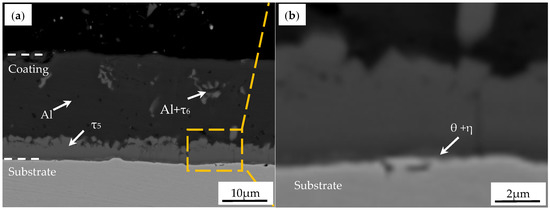 The AS60/60 coated PHS was 1.8 mm thick, and the coating layer was 27 μm thick. The microstructures of the AS60/60 coated PHS are shown in Figure 1. The AS60/60 coatings were structurally continuous without cracks or pores. The coatings were stratified with clear boundary. No Fe2Al5-phase tongue-like structure was found at the interface between the coating and the steel substrate. This was because Si atoms added into the liquid-state Al filled in the c-axial cavities in the orthorhombic Fe2Al5 phase, which blocked Al atom diffusion and inhibited Fe2Al5 growth to the substrate direction. The high-power electron probe shows that a thin layer of interface compounds exists in between the τ5 phase and the substrate. Reportedly, the η phase near the steel substrate is Fe2Al5, and the θ phase near τ5 is Fe4Al13 [18,20,26].