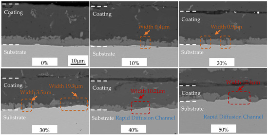 The microstructures of the AS60/60 coatings at different cold rolling reduction ratios were illustrated in Figure 2. The AS60/60 coatings at different reduction ratios were continuous on the whole, without any cracking, peeling or shedding. As the reduction ratio increased, the Al layer was gradually thinned, but was still continuous without cracking. The IMC layer thickness was not related to the reduction ratio and was basically unchanged (about 5 μm). Nevertheless, the status of the IMC layer changed, as it was fragmented and cracked. The IMC layer of the hot-dipped raw materials was uniform and continuous. At the reduction ratio of 10%, the IMC layer cracked throughout, and the cracks were perpendicular to the substrate. When the reduction ratio increased, the crack density rose and the cracks transversally expanded and thereby widened. At the reduction ratio of 30%, the crack width was enlarged from 0.4 to 3.5 μm, and a regional crack in width of 19.3 μm appeared. When the reduction ratio was above 40%, the crack density in the IMC layer was lowered, and the regional crack was filled with the Al layer. At the same time, the θ + η interfacial compound layer at the filling site was absent. Thus, direct contact between the Al layer and the substrate will help with the rapid Al diffusion to the substrate and the rapid Fe diffusion to the Al layer during the subsequent austenitization, forming rapid diffusion channels.