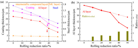 (a) AS60/60 coating thickness and steel substrate thickness at different reduction ratios; (b) Al layer thickness and RatioAl-rolled at different reduction ratios.