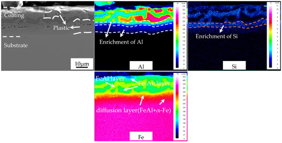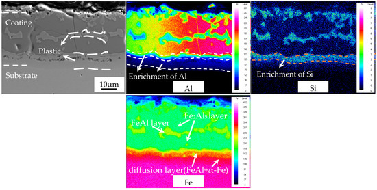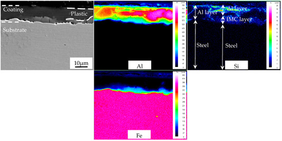 The AS60/60 coating was map-scanned at the reduction ratio 0% in Figure 5. The richest element in the Al layer was Al, but the Al concentration varied largely, and was complementary with the Si concentration distribution. This was mainly because in a eutectoid reaction (L→Al + Si), Fe was scattered in an island-like way mainly due to the crystallization reaction (L→τ6). In the IMC layer, Al, Fe, and Si were all distributed uniformly. At the substrate side of the IMC layer was an interface compound layer of thickness of ~1 μm.