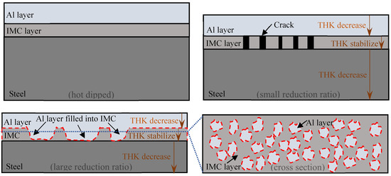 The hardness of the AS60/60 coatings was detected, and the hardness of the Al layer and the IMC layer was about 70 and 600 HV, respectively. The hardness of the B steel substrate increased with the rise of cold rolling reduction ratio. At the reduction ratios of 0–50%, the substrate hardness was 175, 206, 227, 242, 258, 267, 274 HV, respectively. During the cold rolling, the Al layer, the IMC layer, and the B steel substrate were all deformed; the Al layer and the substrate both with high ductility were gradually thinned upon reduction and extended along the rolling direction. The IMC layer was a hard-brittle phase with the largest hardness and low plasticity. Its thickness was basically unchanged during the deformation, and it was fragmented during the coordinated deformation. The fragmentation partially extended along the rolling direction of the Al layer and the substrate. When the IMC layer was fragmented and developed large gap, the outer Al layer filled in the gap. The underlying mechanism is shown in Figure 7.