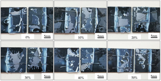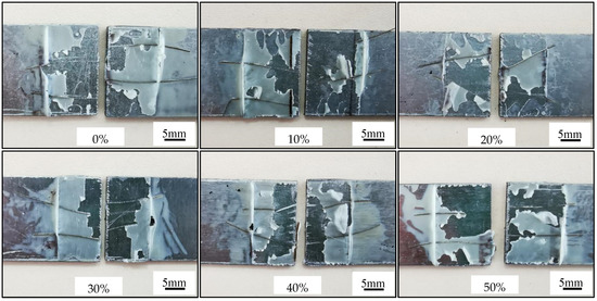 The lap shear strength was 22.35 ± 1.20 MPa in the original AS60/60 coatings, and was 22.25 ± 1.40, 21.60 ± 1.15, 22.10 ± 1.15, 22.40 ± 1.30, 21.80 ± 1.40 MPa respectively in the AS60/60 coatings from 10% to 50% reduction ratios (Figure 9a). The failure type and shear strength were consistent between the two original and reduced coatings, indicating the strength did not change with the variation of cold rolling reduction ratio.