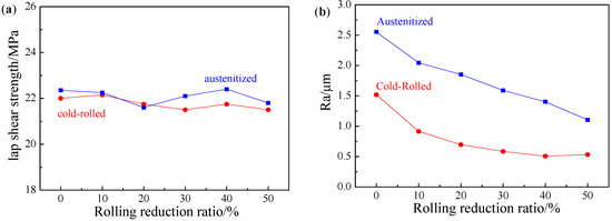 (a) Lap shear strength of AS60/60 coating at different reduction ratios; (b) surface roughness (Ra) of AS60/60 coating at different reduction ratios.